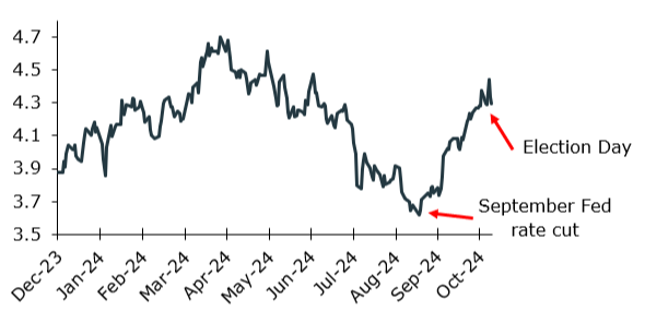 Bond markets also shifted in the run-up to the election as evidenced by the rise in long-term bond yields, which started to rise shortly after the Federal Reserve cut interest rates in September. The 10-year yield has risen 70 basis points since the September cut, likely due to a combination of factors including shifting monetary policy expectations amongst robust economic data. The election-related contribution to the rise is related to the inflationary impact expected from deficit spending, tariffs, and tax cuts. The morning after the election, bonds sold off and the 10-year yield rose by 15 basis points, nearly replicating the bond market’s reaction to the 2016 Trump victory when the 10-year yield rose 20 basis points. By Friday, the 10-year yield returned to its pre-election day level.
