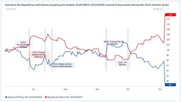 For the last few elections, researchers at Goldman Sachs have identified US equities that could benefit from Republican and Democrat administrations. Researchers then grouped these companies into separate “policy baskets” for each party. As shown in the chart below, shifts in confidence between a Republican versus Democrat victory caused one basket to outperform the other at various points in the campaign season.