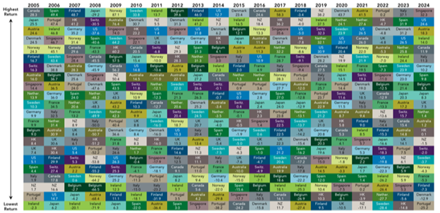 The US is the largest and most liquid market, supported by strong institutions and rule of law, and those factors may have contributed to the US exceptionalism that we have seen over the past decades. But a closer look reveals that while the US performance has been exceptional, it is rarely the best performing market across the globe.