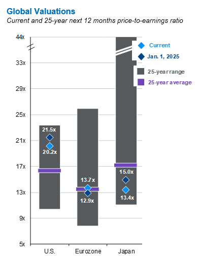 - Valuations matter. US equity valuations are elevated compared to their long-term average and compared to the global opportunity set. While valuations are not predictive, expensive markets may be more susceptible to negative catalysts.