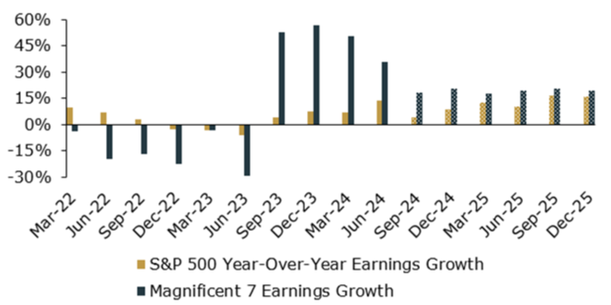 Past performance is not a reliable indicator of current or future results. Indexes are unmanaged and not subject to fees. It is not possible to invest directly in an index. Note: views are from a U.S. dollar perspective. This material represents an assessment of the market environment at a specific time and is not intended to be a forecast or guarantee of future results. Source: Kestra Investment Management with data from Bloomberg. Index proxies: S&P 500, TSLA, GOOGL, META, NVDA, MSFT, AMZN, AAPL. Index data from March 2022 through September 30, 2024. Pattern fill represents estimates. Forward-looking estimates may not come to pass.