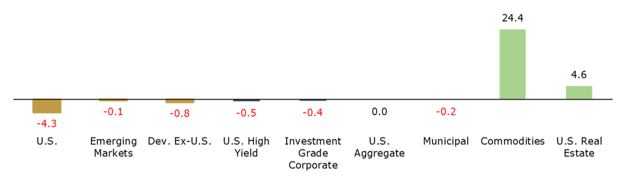 Past performance is not a reliable indicator of current or future results. Indexes are unmanaged and not subject to fees. It is not possible to invest directly in an index. Note: views are from a U.S. dollar perspective. This material represents an assessment of the market environment at a specific time and is not intended to be a forecast or guarantee of future results. Source: Kestra Investment Management with data from FactSet. Index proxies: Bloomberg U.S. AGG Bond Index, ICE BofA U.S. Corporate, ICE BofA U.S. High Yield, Bloomberg Municipal Bond, S&P 500, MSCI EM, MSCI World ex-U.S., Dow Jones U.S. Select REIT, and Bloomberg Commodity Index. Data as of March 31, 2026.