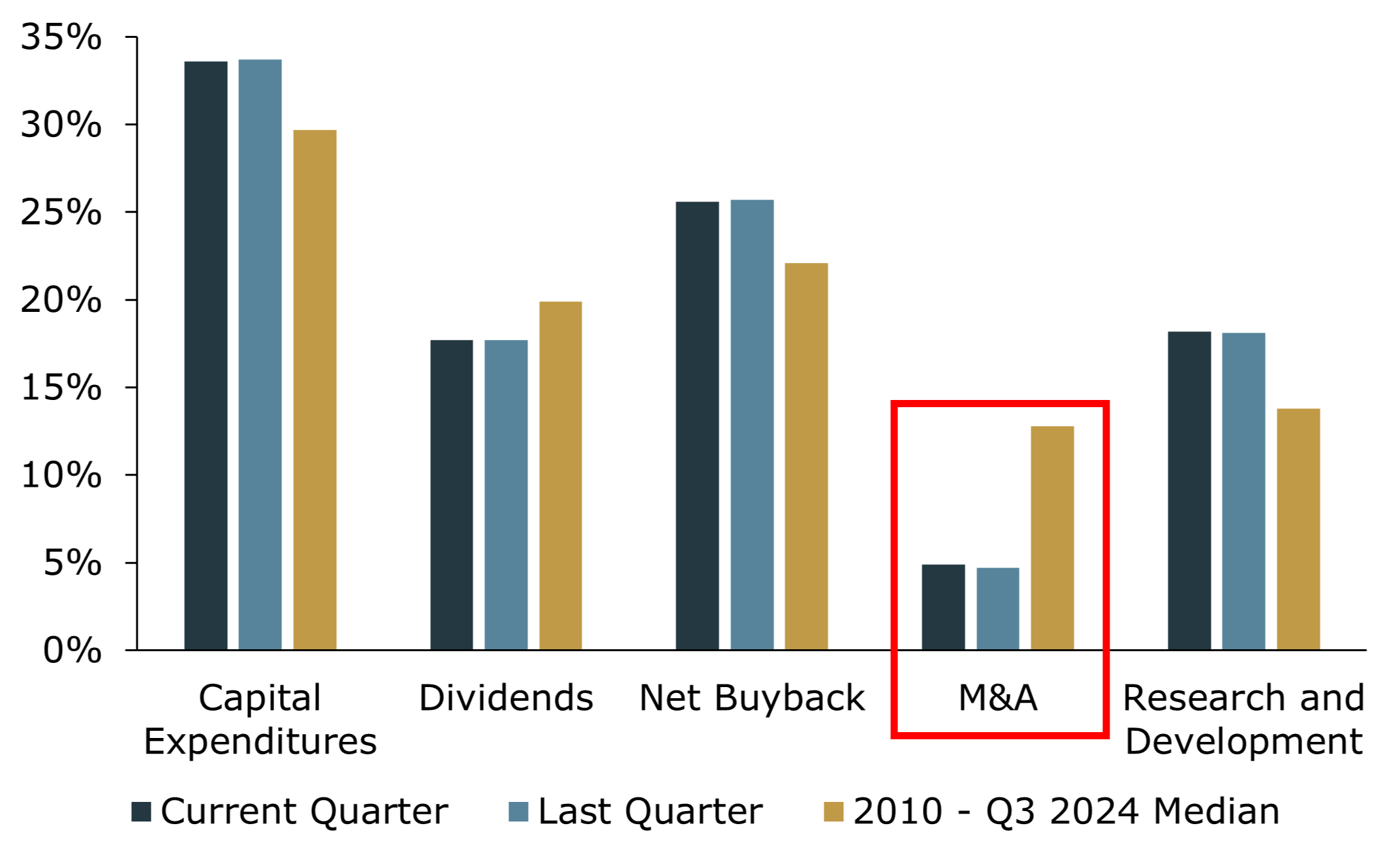 Over the next year, investors expect M&A to slowly gain momentum, helped by easing inflation and the expectation of lower interest rates, which could reduce borrowing costs. Additionally, policy shifts, such as tax cuts and deregulation, are helping unlock stalled deal activity.