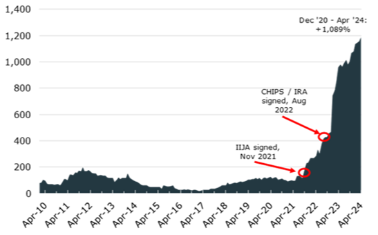 Source: Kestra Investment Management with data from Census Bureau, FRED. Note: Construction spending deflated by PPI – New Industrial Building Construction. Data from January 2010 through April 2024.