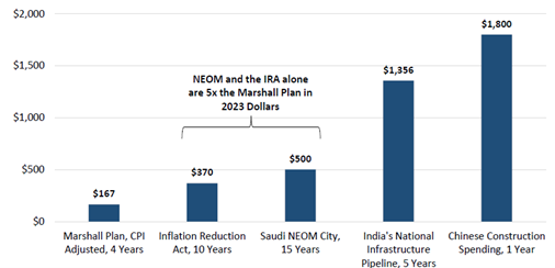 According to research firm Kailash Concepts, current spending plans by a handful of economic powers dwarf the price tag of the U.S. Marshall Plan that revitalized Western Europe in the wake of World War II, as adjusted for inflation. Planned spending tied to the U.S. Inflation Reduction Act of 2022 and Saudi Arabia’s futuristic NEOM project is $870 billion alone, a whopping five times the size of the Marshall Plan in 2023 dollars, notes Kailash.