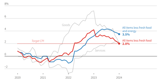 For most of the last 30 years, prices in Japan have grown at a rate below 2%. Then, like many countries around the world, Japan experienced an acceleration in inflation along with Covid-related economic policies. Beginning in 2020, Japan’s core consumer price index, less food and energy prices, began climbing and peaked at 4% in late 2022. Since then, price increases have abated and the latest reading showed 2%, in line with the BoJ’s target.