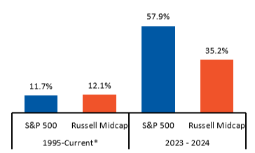 Past performance is not a reliable indicator of current or future results. Indexes are unmanaged and not subject to fees. It is not possible to invest directly in an index. This material represents an assessment of the market environment at a specific time and is not intended to be a forecast or guarantee of future results. Source: Kestra Investment Management with data from FactSet. Indexes: S&P 500 and Russell Midcap. Data as of January 29, 2025.