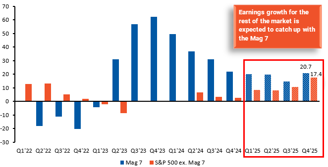 Exhibit 1 shows that while the earnings power of the Mag 7 led the market over the last several years, expectations are for the remaining 493 names in the S&P 500 to narrow the gap. By Q4 2025, the Mag 7 are collectively expected to grow their earnings by about 21% versus the rest of the S&P at 17%—still a sizable margin, but much less than what was seen a year or two ago.