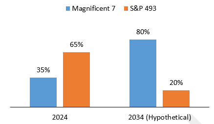 Exhibit 2: Market Capitalization Relative to S&P 500, Current and Hypothetical, Assuming Magnificent 7 Continues to Outperform the S&P 493 for the Next 10 Years