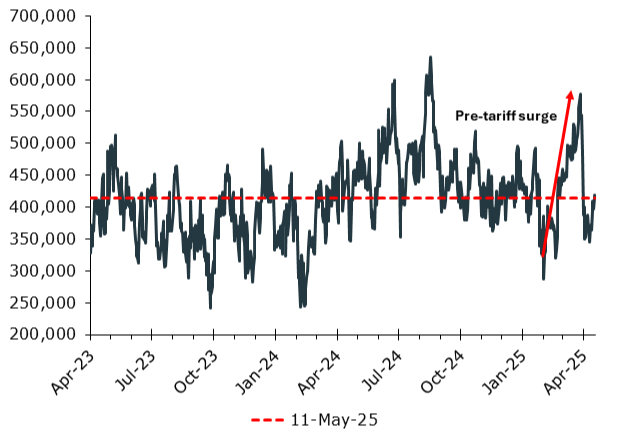 - Despite the April dip, the number of ships en route to the US from China is now higher than this time compared to last year.