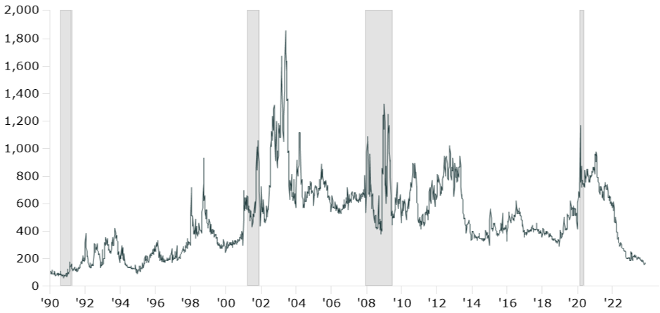 Source: Kestra Investment Management, Mortgage Bankers Association with data from FactSet. Data as of 11/21/2023. Grey areas indicate recessionary periods. Base period and value for the index is March 16, 1990=100.