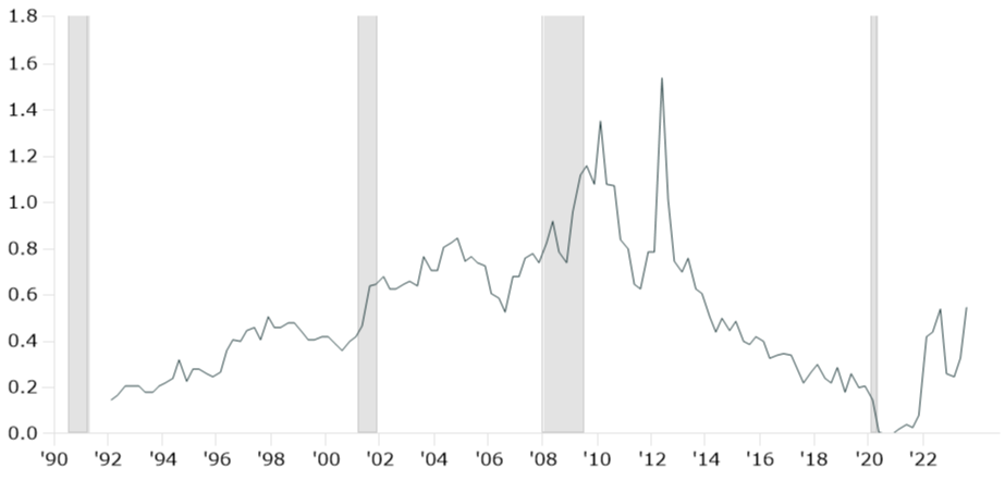 Source: Kestra Investment Management, Mortgage Bankers Association with data from FactSet. Data as of 11/21/2023. Grey areas indicate recessionary periods.