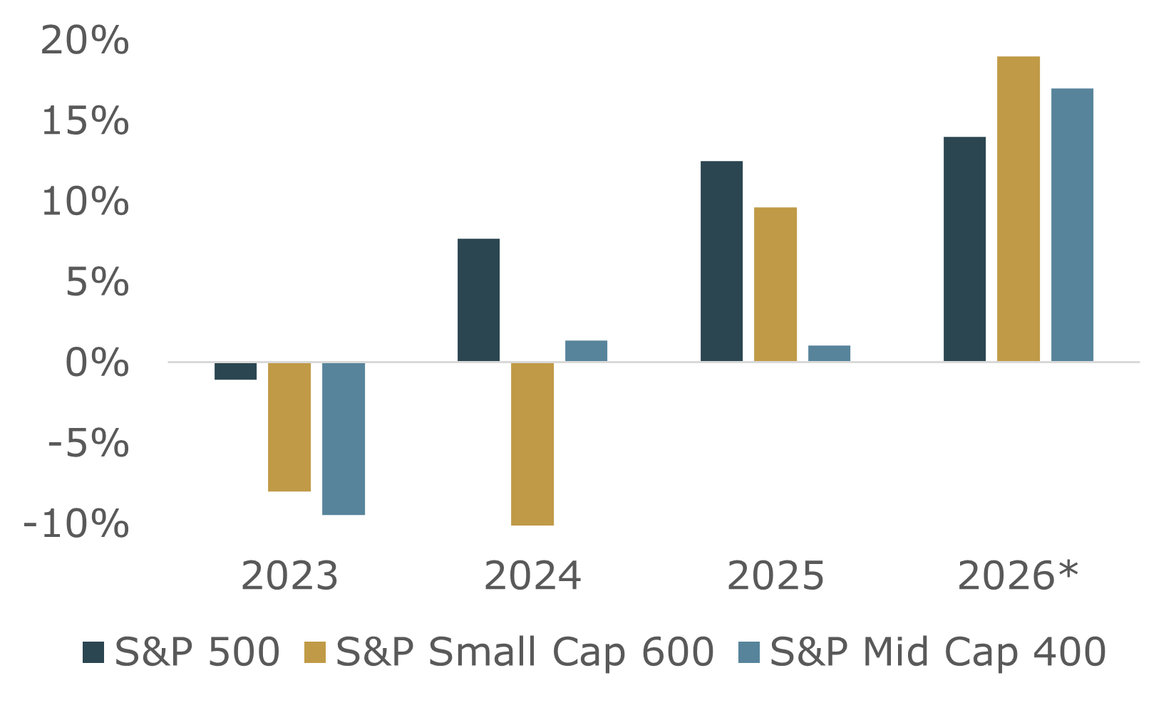 * - 2026 estimates from a Morningstar poll of FactSet analysts. Source: Kestra Investment Management with data from Bloomberg and Morningstar. Past performance is not a reliable indicator of current or future results. Indexes are unmanaged and not subject to fees. It is not possible to invest directly in an index. Indexes: S&P 500, S&P Mid Cap 400, and S&P Small Cap 600.