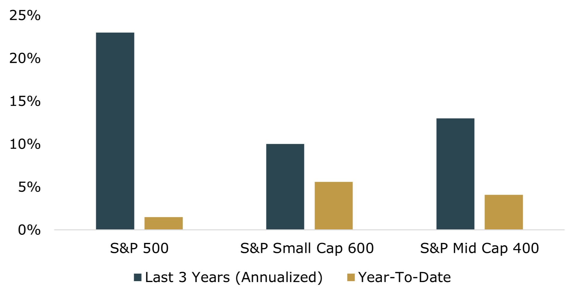 Last 3 Years Annualized and 2026 Year-To-Date Performance: S&P 500, S&P 600, and S&P 400