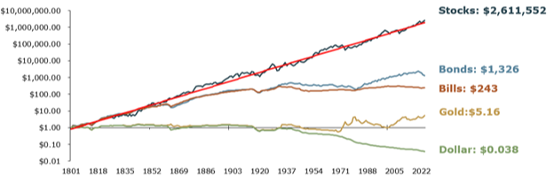 NOTE: Values are indexed to 1, log scale. Past performance is not a reliable indicator of current or future results. Indexes are unmanaged and not subject to fees. It is not possible to invest directly in an index. Source: Siegel, Jeremy, Stocks for the Long Run (2022), 6th edition with updates to 2024.