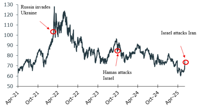 Whether the conflict remains brief and isolated to Iran and Israel, or if it becomes protracted with more countries becoming involved the result is likely to be similar. Volatility in oil, stock and bond markets has recently increased relative to the last two years, and given this conflict it is likely to continue to remain elevated. The difference is likely to be in the extent of this higher volatility: in a contained conflict, it is likely to be short-lived but will last longer if the conflict broadens out.