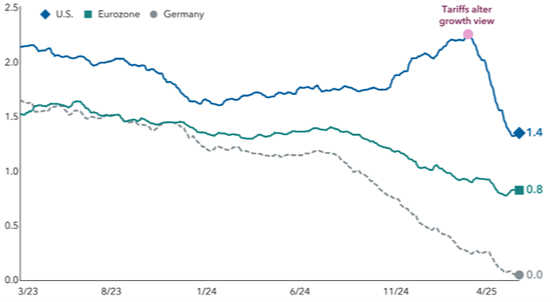 The higher tariffs recently introduced threaten to slow U.S. growth and contribute to a gradual dollar decline. According to Jens Søndergaard of Capital Group, the gap between U.S. and European growth appears to be narrowing (see chart)—and may explain some of the weakness earlier this year in the dollar. It is still unclear whether the shift is significant enough—or whether the changes in growth expectations will last long enough—to prompt the dollar to fall even further.
