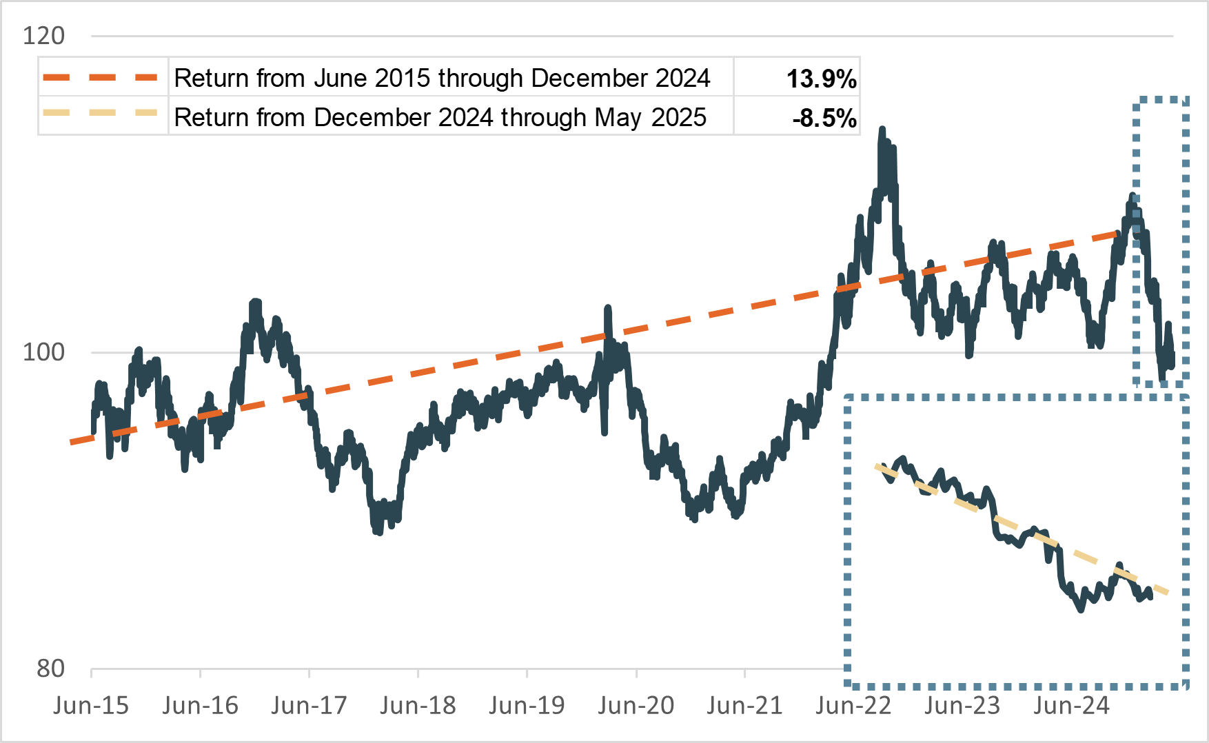 Source: Kestra Investment Management with data from FactSet. The USD Index as represented by the U.S. Dollar Index (DXY). Data as of May 28, 2025. Data begins on June 24, 2015.