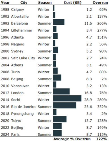 Source: Kestra Investment Management with data from The Council on Foreign Relations, Budzier and Flyvbjerg “The Oxford Olympics Study 2024: Are Cost and Cost Overrun at the Games Coming Down?”