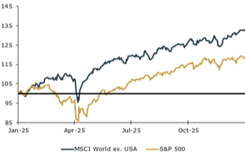 While the market’s momentum is backed by strong fundamentals of double-digit earnings growth for a second consecutive year, valuations have become stretched to levels not seen since the dot-com bubble. In addition, 2025 marked the year when international markets took leadership as the MSCI Emerging Markets index posted a 33% gain, highlighted by outstanding years in South Korea, Brazil, and Mexico. Developed markets excluding the United States also performed well, with the United Kingdom and Japan posting returns of 33% and 25%, respectively.